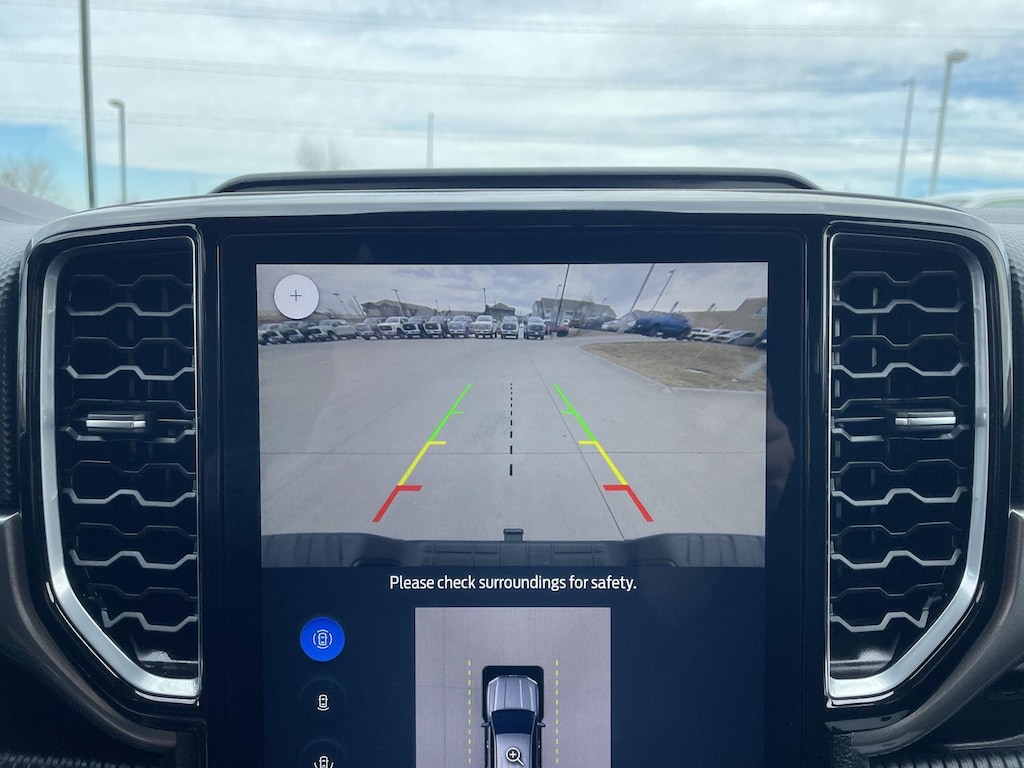 - The vehicle is equipped with a camera that displays an image of the area behind the vehicle on an interior display.