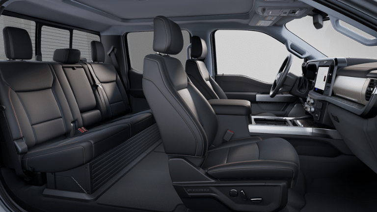 - Includes Ford Co-Pilot360 Assist 2.0, surround view camera, adaptive cruise control with stop-and-go and predictive speed assist, lane centering, automatic high beam, blind spot information system (BLIS) with cross-traffic alert and trailer coverage, front and rear parking sensors, lane-keeping alert, lane-keeping aid, driver alert, intersection assist, pre-collision assist with automatic emergency braking, forward collision warning with pedestrian detection, post-collision braking, reverse brake assist, head-up display, 4-way adjustable headrests, B&O 1080-watt sound system with 18 speakers and subwoofer, HD radio, power running boards, tailgate step, Pro Trailer Backup Assist, Pro Trailer Hitch Assist, trailer reverse guidance, and power-sliding glass with defrost and privacy glass.